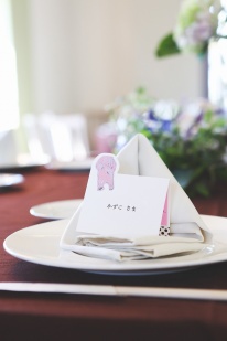 また、ゲストの皆さまに楽しんでいただきたい!という思いから、エスコートカードを選ばれ、ホッキョクグマのマフラーの色によってテーブル分けをされました。エスコートカードもひとつひとつのバッジを奈央さん自らの手刺繍で制作されており、ゲストの方が手に取られるもの全てに、愛情が詰まっており、とても温かい結婚式でした。