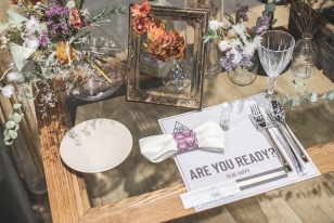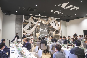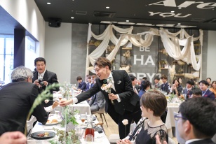 とにかく広く、目の前の人とはパーテーションが用意されており、隣の人との席感覚も広く、コロナ禍でも安心して披露宴を行うことができました。パーテーションには、私たちの名前のローマ字の頭文字がかいてあったり、HAPPY!とかかれていたり、とても可愛いパーテーションが用意されていました。パーテーションを自分達で用意しないといけない式場の話も聞いていたので、至れり尽くせりだなと感じました。また、一人一人のテーブルの上にあるアルコールスプレーのプレゼントはみんなとても喜んでいました。