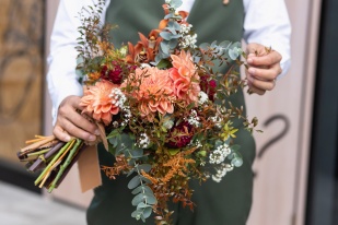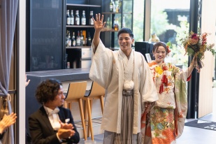 新郎はカーキのタキシードと袴、新婦側がウェディングドレスとオリーブのドレスと和装を着ました。こんなにたくさん着ることができて自分たちも親族も満足でした。