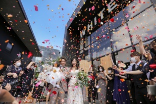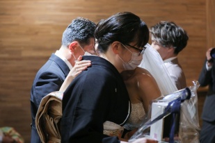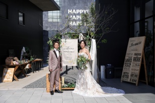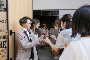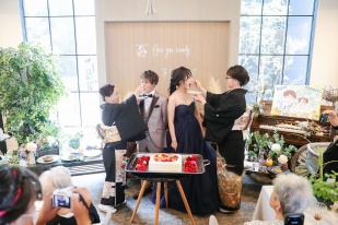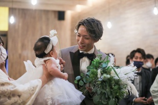 少し落ち着いてはいた時期ですが、コロナ禍での挙式となり、当日は午前に親族での会食、昼前に全体で挙式を行い、ガーデンで乾杯した後、午後は友人達と披露宴を行いました。これは一日完全貸切だからこそのスケジュールだと思います。挙式の際、ゲストから順番に花を受け取り、ブーケを作るといった演出も、みんなと近く触れ合う事ができ、祝福されているといった実感が得られよかったです。また、花嫁へのサプライズとして動画を作成・歌を披露しましたが、そこまでの流れも上手くやって頂き、とても助かりました。