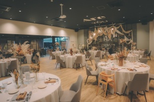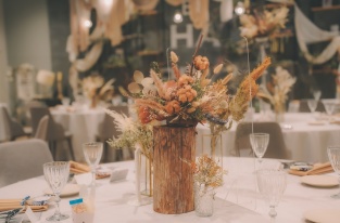 花の装飾も、フローリストさんと打ち合わせし、生花かドライフラワーかが選ぶことができ、お花の色に合わせてナプキンなども合わせていただきました。