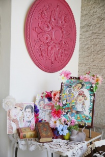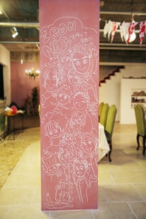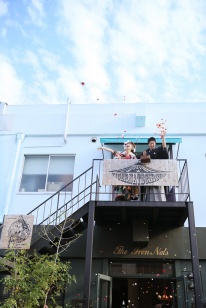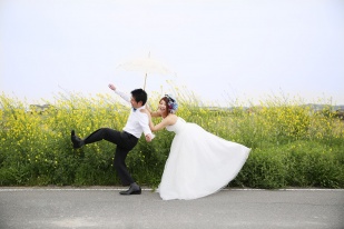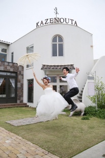 明弘さん、円さんの大好きな愛猫マリ・ユキ・シマとの風ノウタでの前撮り。風ノウタの近くに菜の花が満開でこの時期ならではの素敵な写真もたくさん撮れました。前日のお荷物搬入の際にはアイアンナッツのシンボルのピンクの柱にスタッフの似顔絵を描いてくれて前日からテンションUP