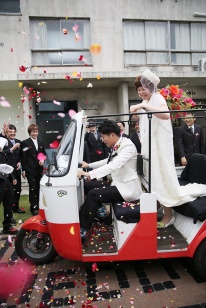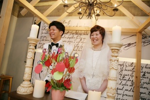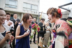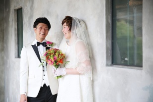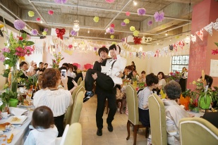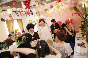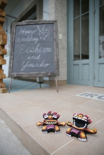 新婦の泰子さんが以前、友人の風ノウタ挙式に参加され、「楽しかったから!」と、アイアンナッツ挙式を決めて下さりました。「沖縄が好き!」から…会場も元気いっぱい沖縄イメージで。「パンチのあるブーケがいい!」から…ハッピーカラーのリュック型ブーケ。