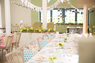 式のテーマを「虹」と決め、会場の色々な場所に虹をちりばめ、ガーデンには大きな虹をかけました。夏空、ひまわり、虹と…