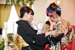 入場のときのお母様からのベールダウン、今まで育ててくれたお母様からの最後の身支度が終わって、お父様と一緒にバージンロードを一歩一歩進いきます。