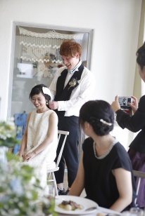 せっかく来てくれるからには、みーんなとゆっくりお話しできる時間と、ゲストに何かしてほしいとお願いするのではなく、自分達でゲストのみんなに楽しんでもらえる何かをやりたい!そこで、美容師の諒一さんにしかできない演出を・・・!!ということで、お色直しのヘアチェンジをみーーんなの前でやりました!!新郎によるヘアショーです!朝のお支度ではゲストのヘアセットもして、披露宴の中では花嫁のヘアショー。みんなの嬉しそうで楽しそうな笑顔をいっぱい見ることができました。諒一さんからのサプライズプロポーズもあり、さやかさんはずーーーっと天使の笑顔でした!!ゲストのみんなとたくさん写真を撮ったり、お話したりする時間もたっぷりあったので、お2人の幸せそうな笑顔もたくさんみれました。そして、新郎新婦からのお手紙。スタッフも我慢しきれず大号泣してしまいました。お2人の伝えたかったことが、ちゃんと伝わった最高の結婚式でした。